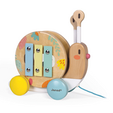 This wooden snail to pull-along is very funny! The shell turns when you walk it and is removable to reveal a tambourine and a small xylophone! The antennas of the snail are also removable and form the rods. A nice companion in very soft and very modern tones that will awaken your child to music in a ludic way!